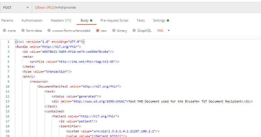 In order to provide a document, a FHIR bundle encapsulating it should be provided within the request body. In the provided collection, an example document is provided but it will not work as the document already exist in the system. Copy and paste the encapsulated document previously built in the body tab of the request in Postman. Make sure raw and XML/JSON are selected in the parameter depending on your needs :
