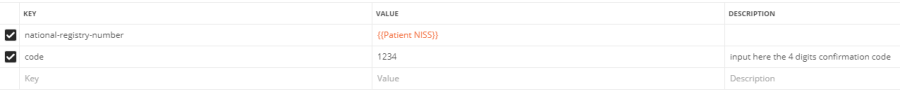 On the Params tab, a code field is present. Enter the confirmation code received by the patient in the corresponding value field